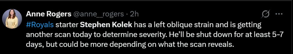 Oblique injuries can be tricky and this situation bears watching. It’s also a good reminder how fragile and ephemeral “starting pitching depth” really is.